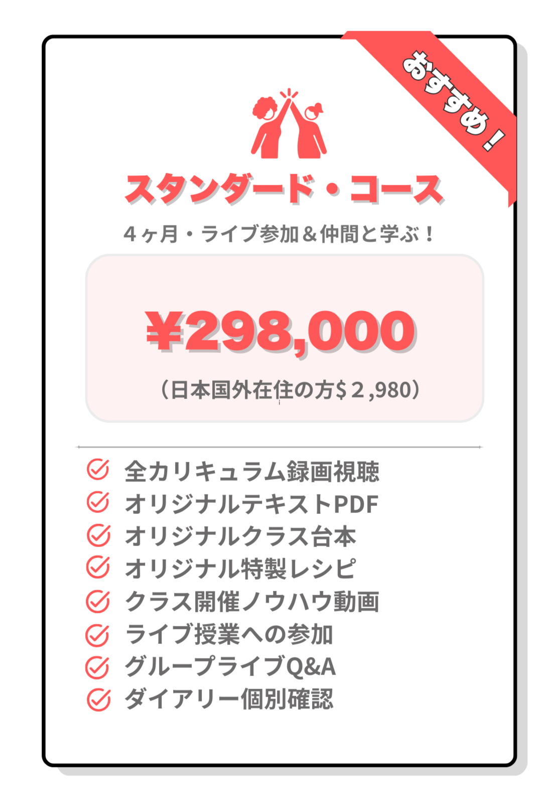 医師たちもお墨付きのKD健康教育を週1回のセッションで学びます。栄養学の基礎やヘルシーなライフスタイルを自らの実践を通して学べるので、なるほど納得!と楽しく学べます。またライブで参加できない時もアーカイブビデオがあるので、空いた時間で後から学べて安心です!